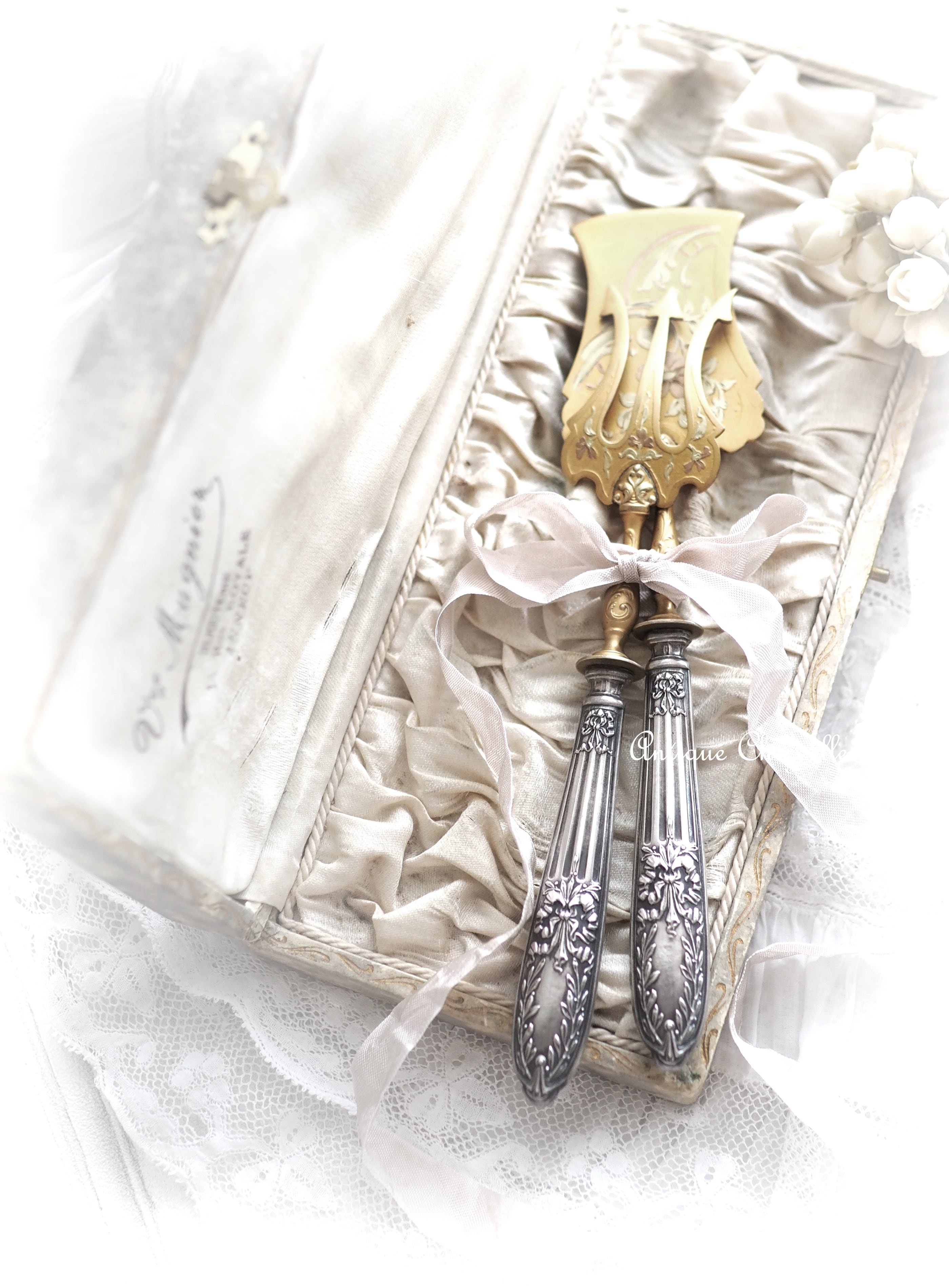 リボン&フラワー模様で装飾された純銀ハンドルの